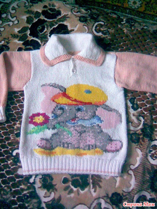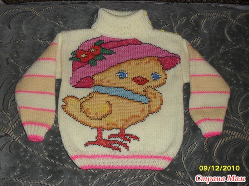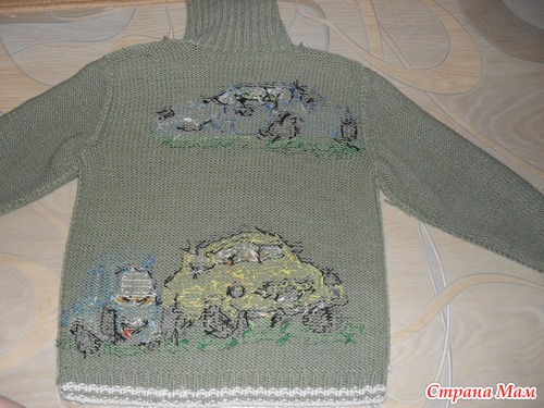 Очень прикольно вышивать (не вывязывать) узоры и картинки на уже связанном полотне. Вышиваю нитками "мулине" до того, как сшивать. Можно рассчитать правильно расположение узора. И получается очень аккуратно.