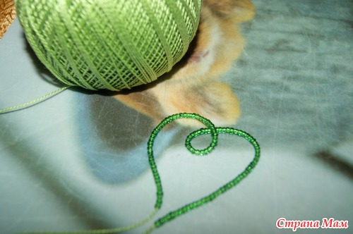 набираем бисер на нить, её кончик предварительно можно смазать клеем и высушить, для удобства