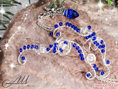 Материалы: Посеребрённая немецкая проволока, стеклянные чешские бусины, бисер, цепочки, металлическая подвеска