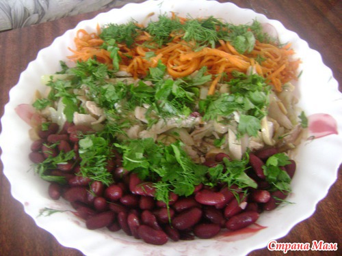 В глубокую тарелку/салатник по отдельности положить Морковь, мясо с грибами и луком, фасоль. Между ними положить майонез. Посыпать зеленью.