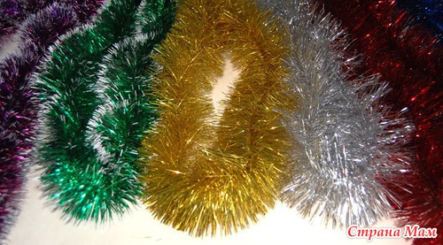 Делается все просто, начиная с низу рядами клеим мишуру, конфеты, мишуру, конфеты и так до самого верха