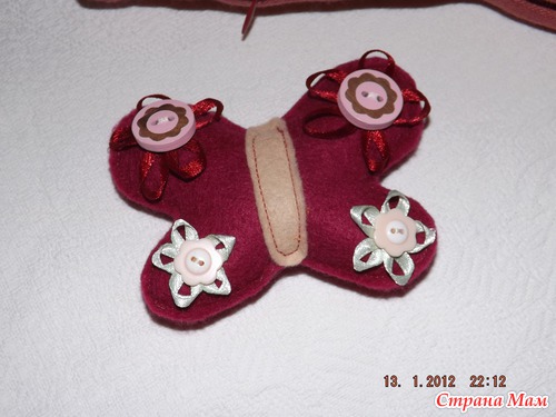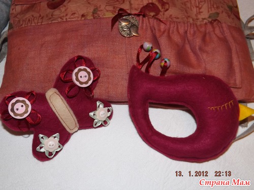 Бабочка... Просто бабочка. Когда уже сшила, подумала- надо было её шуршащую сделать или тоже погремушку, но было поздно.. В прямом смысле слова, 2 часа ночи! Поэтому получилась просто бабочка с деревянными пуговичками и ленточками.