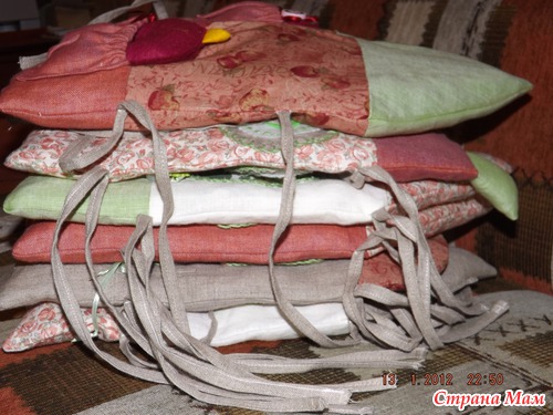 Вот такие подушечки.. Состоят из наволочки (при желании можно снять и постирать) и подушки с синтепоном. Подушка немного прошита, чтобы синтепон не сбивался.