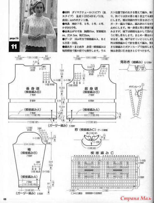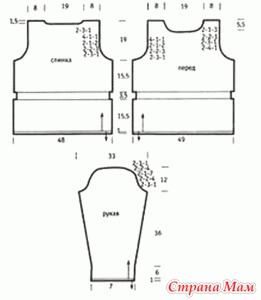 Теперь шишечки по схеме пропускать и не вывязывать, а кромочную петлю вязать как изнаночную чулочную, вязать в дальнейшем 23 петли схемы так: 11 петель, присоединить другой клубок и вязать по схеме дальше новой нити Продолжать так вязать, вывязывая пройму, как на спинке. Одновременно на высоте 33 (38, 38.5, 39.5) см начать вывязывать горловину, убавляя провязывая 12-ю и 13-ю петли вместе (т. е. нарушая рисунок) с двух сторон со стороны горловины в каждом ряду. На 7 ряду схемы слева вместо 2 петель вместе вязать 3 вместе лицевой, а справа – вместо 2 вместе 3 вместе перевернутой лицевой. Убавлять по 1 петле со стороны горловины в дальнейшем в каждом ряду 9 (10, 9, 10) раз вязать до высоты спинки Закрыть 18 (19, 20, 21) петель для плен с двух сторон. Рукава: Набрать 18 (20, 22, 24) петли и вязать 4 5 см платочной вязкой. Закончить лицевым рядом. На изнаночном ряду вязать так: 5 лицевых, остальные изнаночные. Следующий лицевой ряд – все лицевые. Повторять эти 2 ряда до высоты 10 см. Нить оборвать, оставив петли незакрытыми. Набрать еще 18 (20, 22, 24) петли и вязать 4.5 см платочной, изнаночный ряд вязать так: все изнаночные, последние 5 петель – изнаночные. Лицевой ряд – все лицевые. Вязать 10 см. Следующий изнаночный ряд: все изнаночные, добавить отложенные петли и провязать их тоже изнаночными. На спицах – 40 (44, 48) петель, вязать чулочной вязкой, добавляя по 1 петле с двух сторон каждый 8 ряд 4 раза.