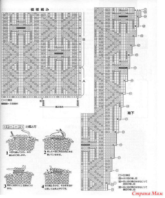 Полоса: Набрать 69 (73, 77, 81) петли. Вязать 2 см платочной вязкой. Закончить на лицевом ряду. Затем на изнаночном ряду вязать так: 5 лицевых, изнаночных 26 (26. 30. 32). 5 лицевых Следующий лицевой ряд 23 (25, 27, 29) изнаночных петель, 23 петли схемы. Вязать до конца. Продолжать, как установили, повторяя 1 -8 ряды схемы. Одновременно убавляя и прибавляя, как на спинке до 25,5 (25.5, 26.5, 26.5) см от начала. Затем вязание разделить и вязать отдельно.