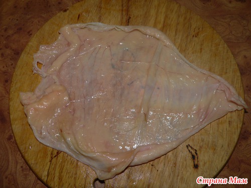 было у меня две куринных грудки, а нужно было сделать филе, аккуратненько шкуру с курочки снимаем, с грудки она очень легко снимается!