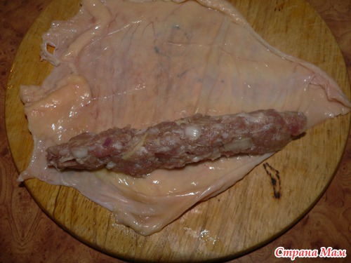 Заворачиваем любой фарш (у меня обычный котлетный), при необходимости протыкаем по краю зубочисткой, у меня одна хорошо держалась, а вторую пришлось пристегнуть!