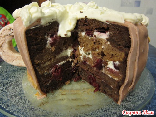 И так тортик шиколадный бисквит, заспиртованая вишня, сливки. Это был маленький презентик мужу) Мастика из самодельных мармышек. У меня она получилась ну очень липкой. На 100 гр мармышек я положила 200 гр пудры. Два дня она лежала, а когда начала вымешивать, так крахмала ушло очень много. Я просто посыпала стол а она все липнет и липнет к рукам. С большим трудом смогла раскатать полосочки на кружку, очень мастика прилипала к столу, хоть и крахмала много было. Тортик у меня был весь белый от него. Что бы покрыть круглый торт никогда бы не раскатала