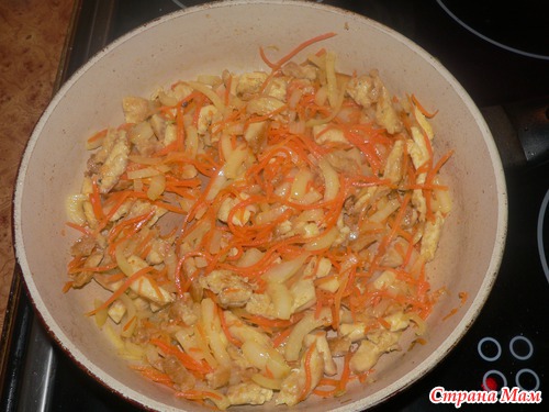добавляем лук полуполукольцами, морковь соломкой, тушим мясо с овощами еще минут пять.