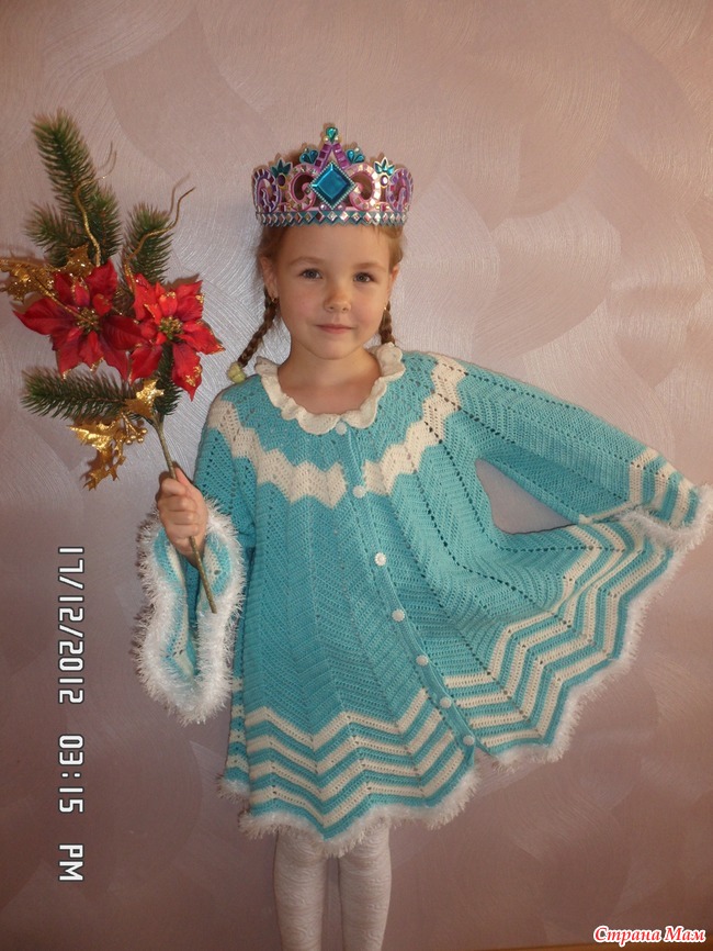 Вот краткое описание, но это на 1-1.5 года,(я брала количество петель изначально больше): Число петель кратно 5. Наберите цепочку из 80 возд. п. + 3 п. подъема и вяжите по схеме. После выполнения 17-го ряда разделите вязание на перед, спинку и рукава. По 4 клинка на рукав и 8 клиньев на перед со спинкой. Далее вяжите рукава по кругу еще 8 рядов (= 25 рядов). Последний ряд обвяжите ст. б/н. Далее низ рукава обвяжите 1 рядом ст. б/н нитью белого цвета. После разделения работы продолжите вязание спинки и полочек, выполните 14 рядов - от наборного края 31 ряд. Обвяжите последний ряд ст. б/н. Нитью белого цвета выполните обвязку планок - 3 ряда ст. б/н. Далее обвяжите все изделия по периметру 1-м рядом ст. б/н.