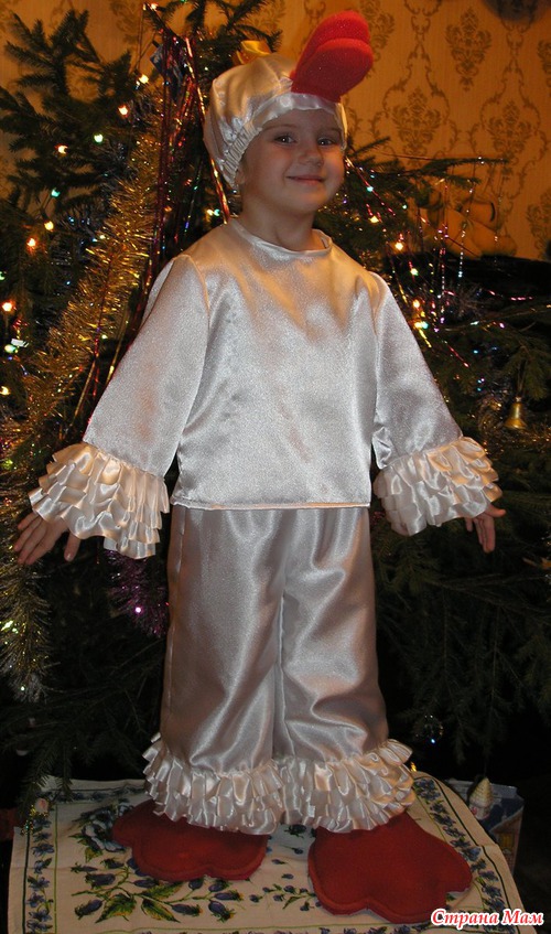 Костюмы для танцев все шью сама. Этот костюм несложный - штанишки и кофточка с оборками, шапочка с клювом из пороллона и "пипочкой". Лапки тоже из пороллона. Потом мы в этом костюме ходили на елку, как в карнавальном.