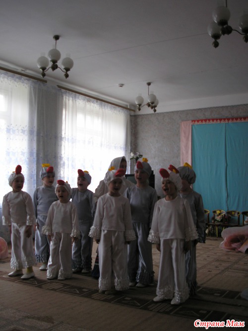 А вот еще гусята, это правда уже другой состав и фото сделано позже. Выступление в детском саду, дочка впереди вторая справа.