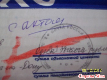 Я забеспокоилась, хотя прорезь нетакая уж большая, думаю врядли что-то могли подменить, но разница в весе - короче я уже не знала, что думать и делать, но рядом был Младшенький и уже принес ножницы со словами " посылька, посылька!" Открыла, увидал свернутый пополам большой пакет и от сердца отлегло - уж его поменять, не открыв посылку, возможно только Деду Морозу