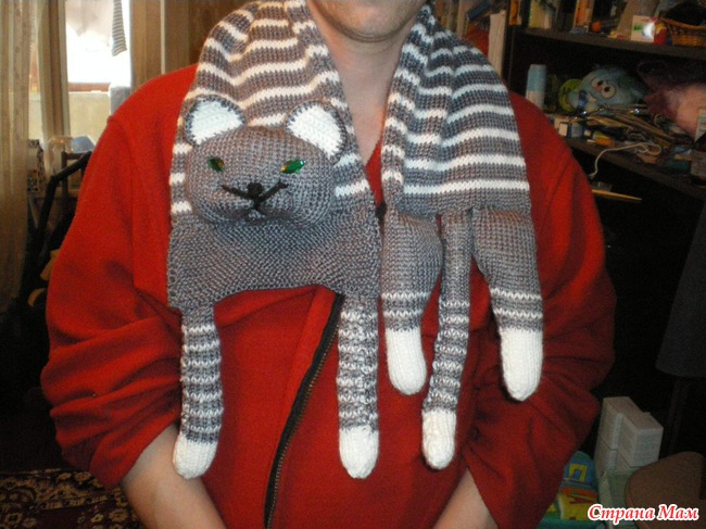 Шарфик вязала двойной полой резинкой, т.е. он получился двусторонний и все хвостики от перехода ниток спрятались в середину. Мордочку вяжу крючком, мне так больше понравилось.