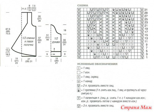 Ажурная планка: вязать по схеме, на которой приведены только лиц. р., в изн. р. петли вязать по рисунку, накиды - изн. т лиц. скрещ. - изн. скрещ. Повторять с 1-го по 32-й р. Плотность вязания. Лицевая гладь: 20,5 п. и 28 р. = 10 х 10 см; ажурная планка: 21 п. = 9 см»