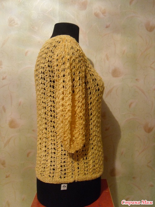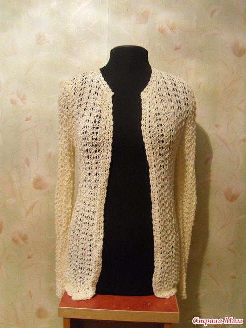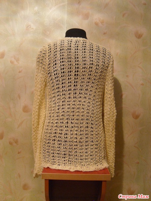 ) связать ей жакет с длинным рукавом, "с дырками", чтобы летом можно было носить и никаких пуговиц и даже завязок не надо. Начала выбирать узор и, в конце концов, остановилась... на таком же, как связала себе блузу! Со мной такого еще не бывало