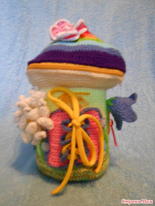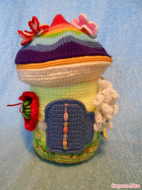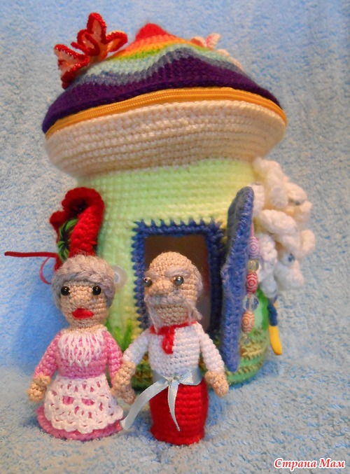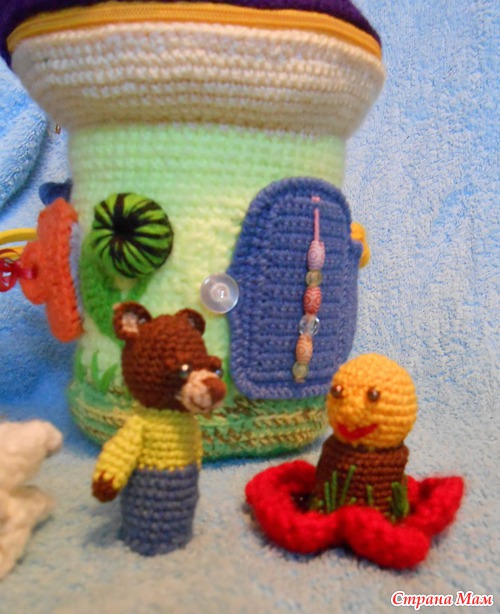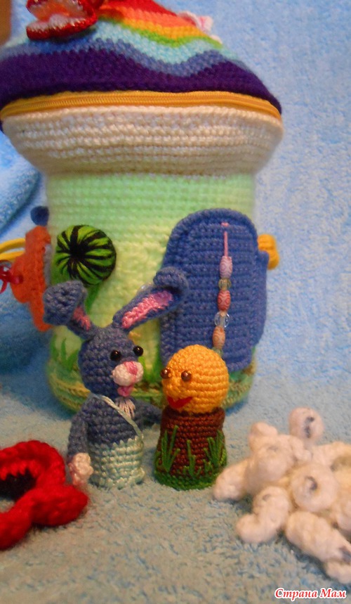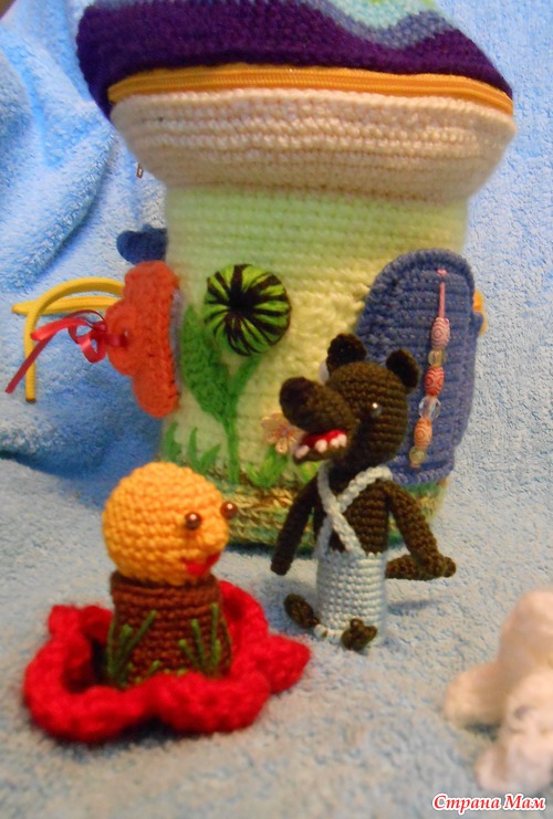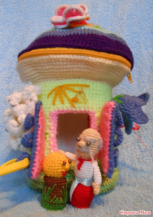 Очень необычно для ребёнка!! Классная идея с домиком сумочкой. Столько мелких деталей связать,уйма терпения надо. Вы молодец!Я ленивая до мелочи,мне лучше плед связать,чем пару игрушек))