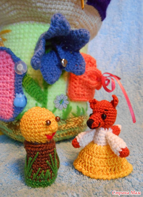 все вязала сама, но есть девочка Ярослава, которая публикуем подобные МК - http://jaraslava.stranamam.ru/ , попробуйте у нее посмотреть, там очень симпатичные игрушки на пальчики и теремочки)))