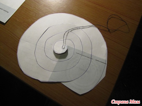 2) В центре спирали проделываем отверстие продеваем сквозь него нитку