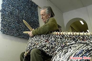Дело в том, что вместо пряжи он использует старые газеты и журналы, нарезает на полоски, скручивает в огромные клубки и все это без применения клея.