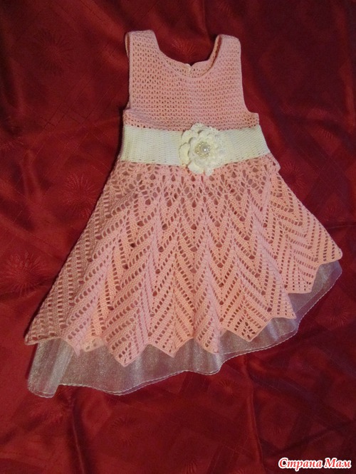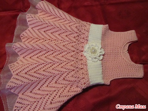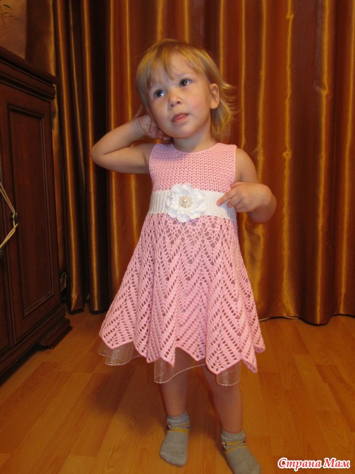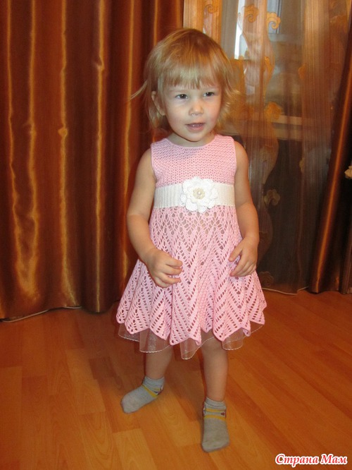 Связалось платье в он-лайне, спасибо огромное Тане-Танечке-Танюше за организацию он-лайна. нитки пехорка жемчужная, ушло всего 1,5 мотка розового и немного белого, крючек 1,5, возраст доченьки 1,8 мес.