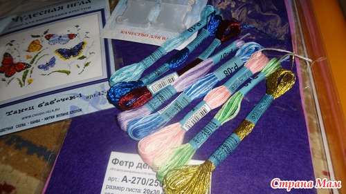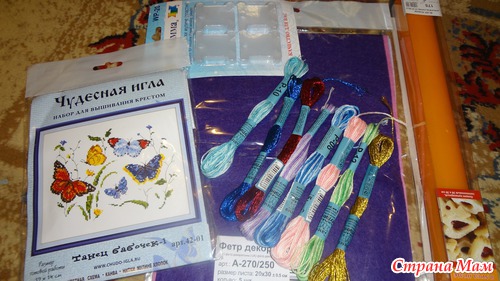 Набор фетра, мулине меланж и металлик, бабинки для них, небольшой наборчик для вышивания, и силиконовый коврик для выпечки, ну и думаю еще будет что-нибудь в качестве сюрприза к НГ!