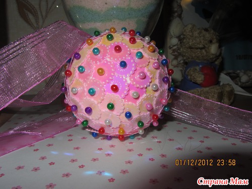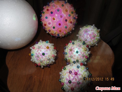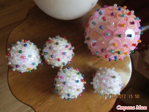 Купила в магазине для творчества несколько белых шариков из пенопласта, английских булавок, фигурных пайеток и решила сделать что -то новенькое на елочку...