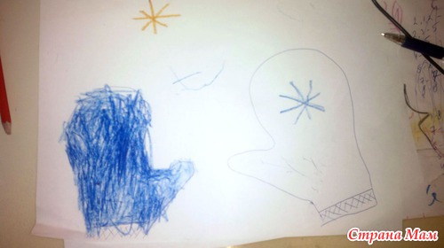 Рисовали варежку, потом раскрашивали. Не любит она раскрашивать. На компьютере пожалуйста, а сидеть чиркать карандашом видимо нудновато для нее.