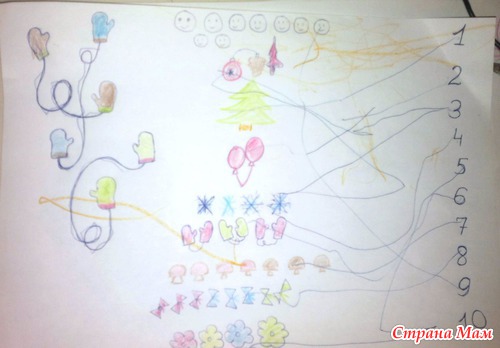 Распутывали и раскрашивали варежки. И находили предметы к цифрам.