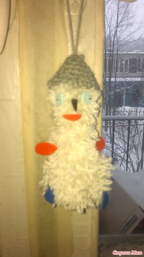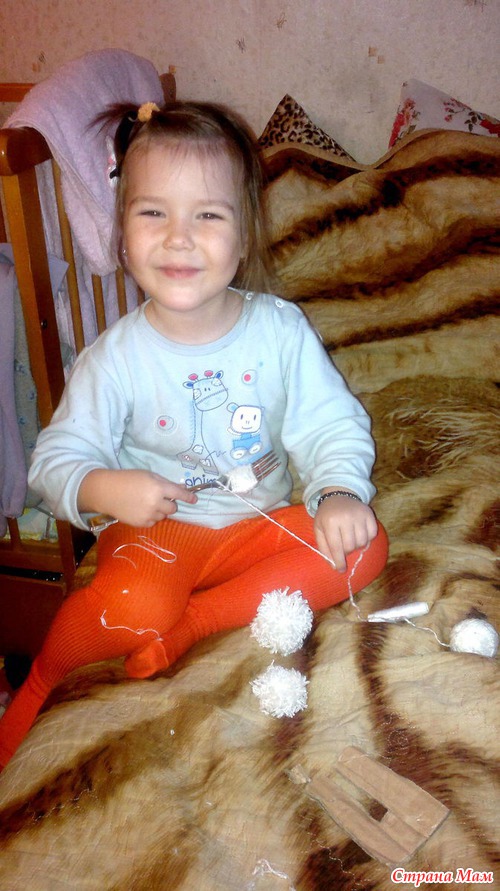 Потоом делали снеговика. Наматывает помпон на вилку