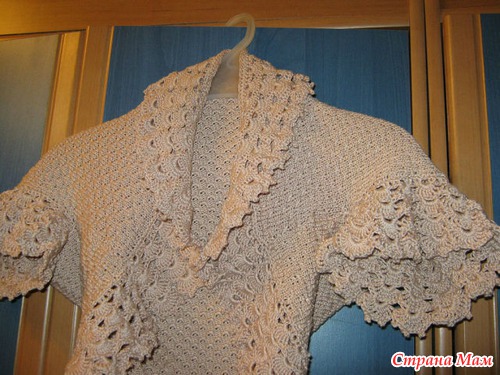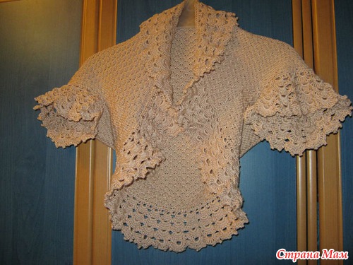 Милый мой день сидит за машиной, другой - разбирается. Потом попросил какой-нибудь журнал, потом в интернет опять полез... Потом, смотрю, пряжу мне уже заказывает. В итоге, он себе шапку связал, правда она так и ждет, пока ее соберут. А еще дочке связал платье и основу для болеро. Платье я взялась обвязать, потом украшение придумала, короче, в работе оно еще. А болеро у нас вот такое получилось: