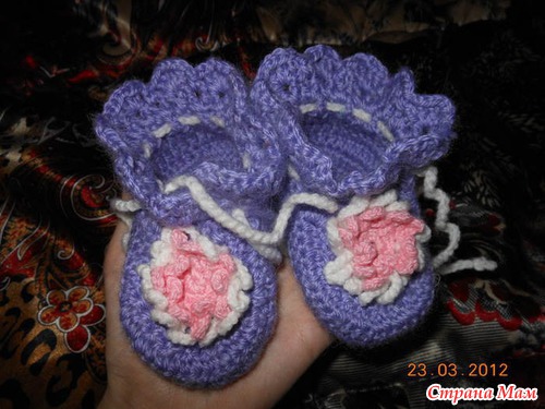 16. Обвязываем верх пинетка по ряду, где привязали новую нить и начали вязать мысок. Пять воздушных петель, соединительный столбик. Вводим крючок через столбик.