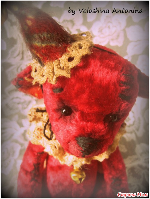 Набит опилочками, сшит из винтажного плюша, 5 шплинтов(живое крепление), самостоятельно сидит, а вот стоит с трудом. Воротничок и колпачок снимаются, одежда и сам мишка полностью сшиты вручную, рост 20см.