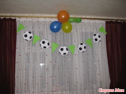 Гирлянда. Распечатала изображение мяча. Вырезала зеленые вымпелы-треугольнички. Скрепила степлером.