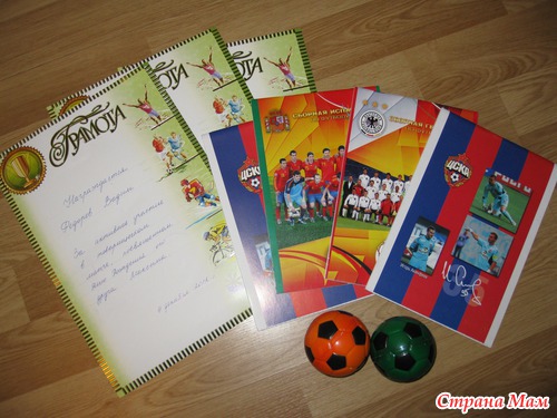 Далее проходит торжественно награждение участников, вручение грамот и памятных сувениров. В нашем случае это были блокноты, сувенирные мячики, грамоты и сладости. Именинник получил в подарок Футбольную монополию.