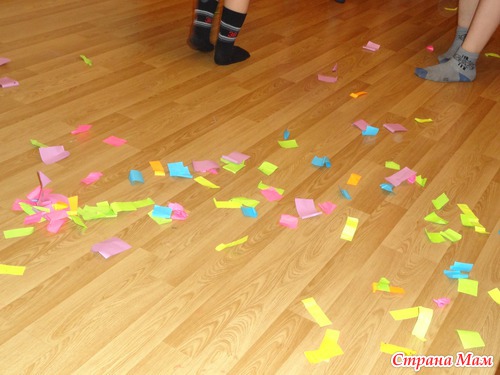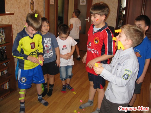 Затем был конкурс "штрафники". Смысл в том чтобы быстрее соперника наклеить на себя желтые или красные стикеры. Конкурс получился очень веселым, шумным. Участвовали все! Каждая из команд получила за этот конкурс, как и за предыдущий, по очку.