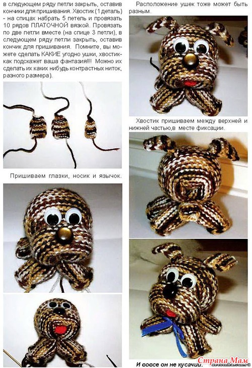 Так можно сделать практически любое животное, например, кошку, бычка или оленя, зайчика (связав длинные уши). Можно связать из нескольких цветов пряжи (например, голову одного цвета, а мордочку другого, поменяв цвет на середине вязания), а можно усложнить и связать из 3-4 цветов (например, голову темного цвета, а мордочку вывязать светлого, но только среднюю часть, что бы лапки были одинакового цвета) Оформление тоже разное.