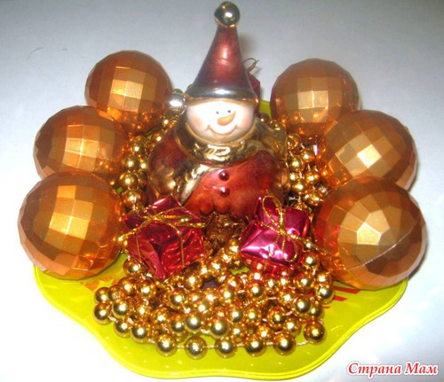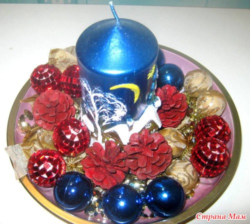 Берете красивые тарелочки, вазу, свечу, елочные шары, шишки, маленькие подарочки, бусы. Все оформляете и красота.