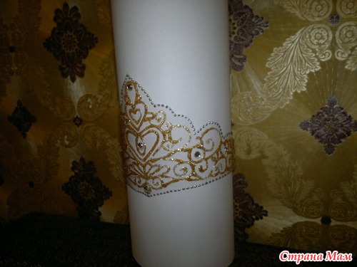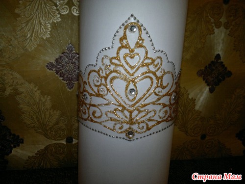 Распечатала трафарет на принтере, бутылку разрезала, подложила трафарет, вырезала по нему, но немного с отступом (миллиметров 5). Потом по этому же трафарету рисовала золотым глиттером с блёстками (можно контуром акриловым), приклеила стразы и контуром акриловым по краю точечки нарисовала (ну или можно тоже глиттером)