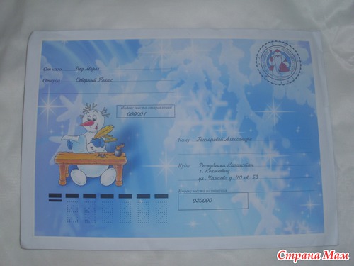 Мамочки, я уже третий год занимаюсь письмами от Деда Мороза, это уже отлаженный творческий процесс, который доставляет радость не только мне, но и деткам. Это красивое письмо на глянцевой бумаге с текстом именно для Вашего крохи, если малыш заслужил грамота к нему, все в красочном большом конверте с отпечатанным адресом малыша и самое главное это печать, настоящая сургучом и на ней надпись Почта Деда Мороза. К каждому письму прилагается бесплатная лотерея и три удачливых малыша 31 декабря получают подарки. Если хотите могу Вам помочь в изготовлении такого письма пусть и в нашей стране у деток будет праздник и своя сказка.