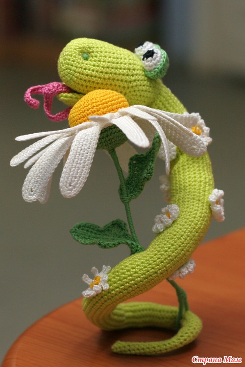 по этой ссылочке можно найти описание змеи, по нему я и вязала, ну,только глаза немного другие сделала и мелкие ромашки добавила.!!