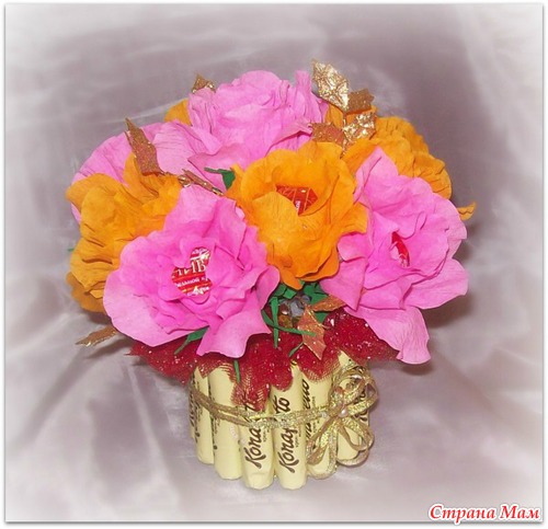Давно заглядывалась на конфетные букеты, очень хотелось попробовать. И вот повод у моей сестренки день рождение, не долго думая закупила все необходимое и начала вытворять. Вот что получилось: