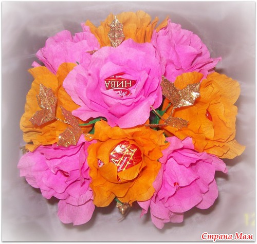 Прекрасный букетик! Здоровский подарок к празднику! Я как-то дочке на конкурс делала, правда розочки в бутончике были. Ваш мне очень понравился! Даже и не скажешь, что первая работа. а сколько времени потратили на него?