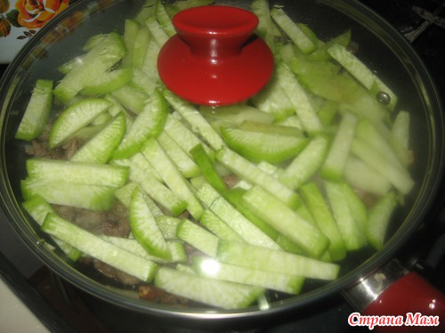 Редьку режем брусочками, добавляем к мясу, закрываем крышкой, даем по томиться минуты три