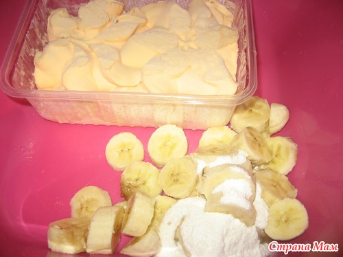 Повезло, что все необходимое было к холодильнике. А это: мороженное, отрезала брусочек; 2 банана; молоко 2 стакана; в шкафчике нашлась сахарная пудра, взяла 3 ст. л.