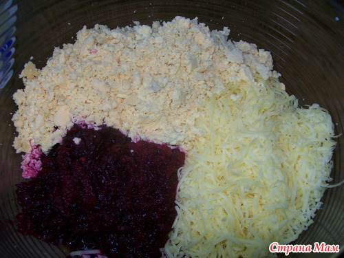 P.S. варенная свекла и морковь очень сочные, можно пока готовятся ингредиенты, натереть их первыми и оставить стекать... если получается наоборот суховато (много сыра) можно добавить немного майонеза для склейки...