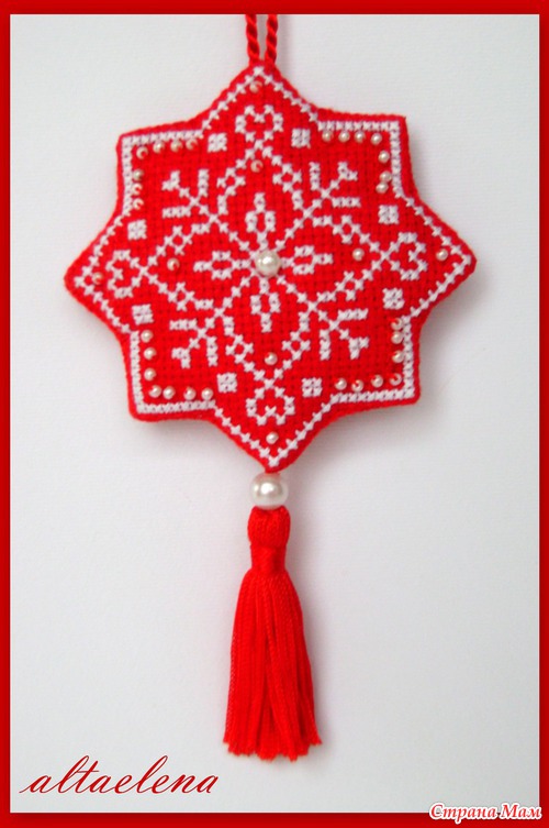 Очень мне понравилась снежинка на красной канве.