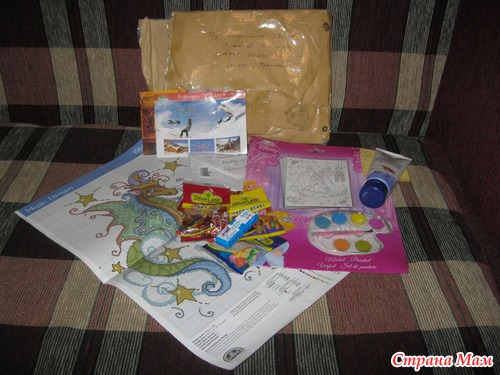 Там еще мулине были, но они сохли)) Почта у нас аккуратностью не отличается и поэтому посылка дошла не совсем в целости, приоткрылся крем и немного вытек, перепачкав половину сюрпризика( Но все удачно сложилось, все отмылось, высушилось и я довольна!)))