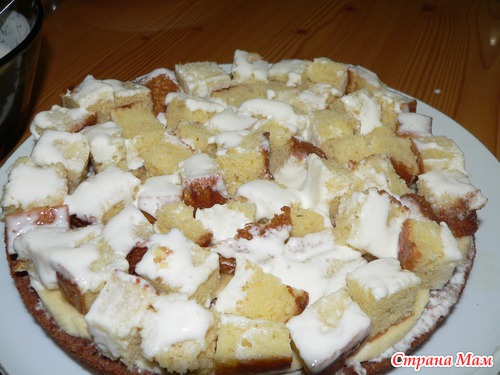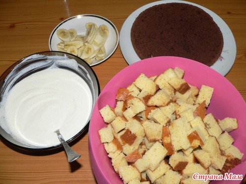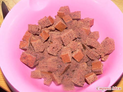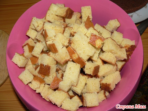 Выпекаем два коржа, остужаем, разрезаем один из корже пополам и низ оставляем для основы. Другой корж и низ режем на кусочки примерно1*1 или 2*2, как получится.