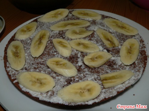 Основу нашего торта смазывем сметаной и выкладываем ряд бананов,